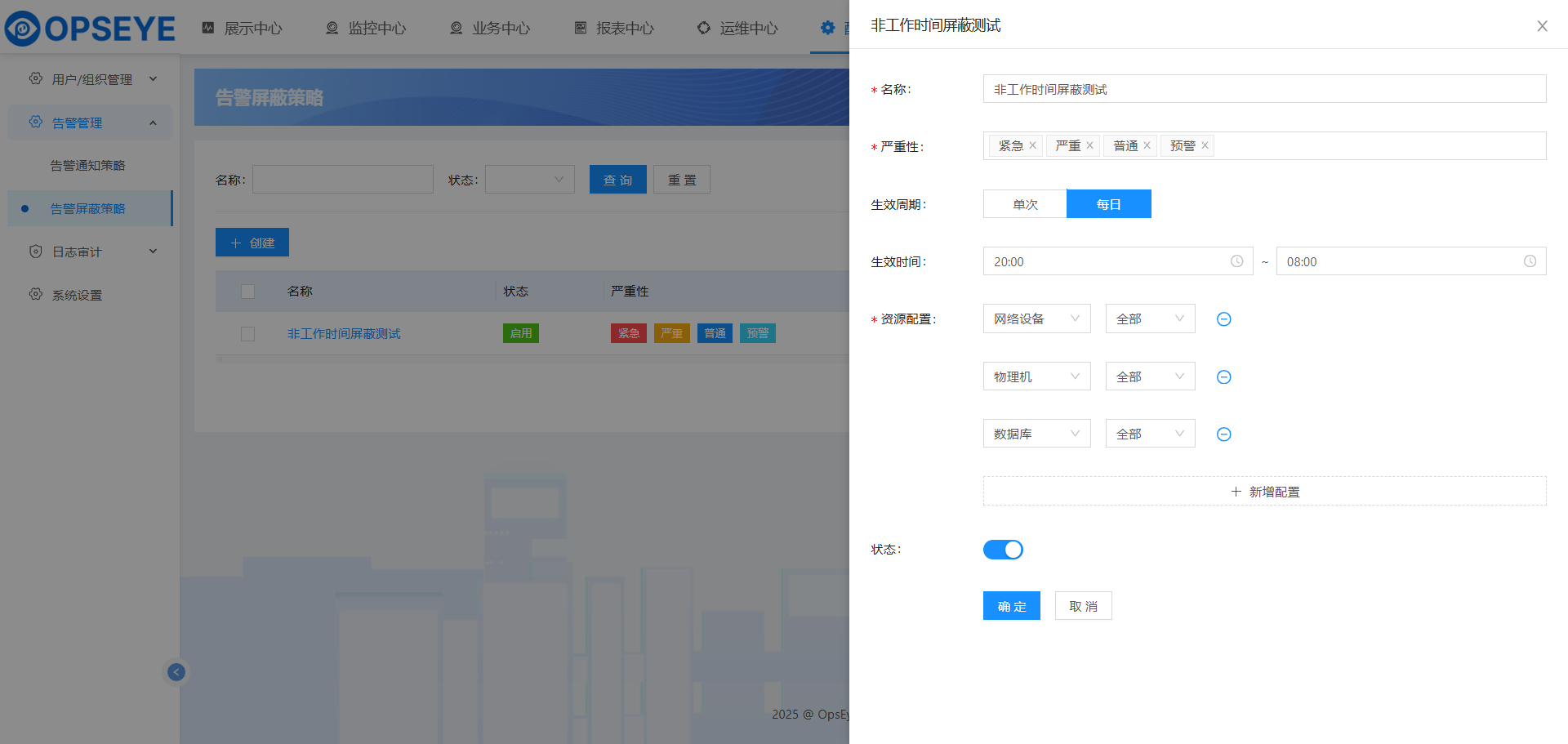 生效周期与时间自定义:提供单次和每日的生效周期选择 ,并且能灵活设置生效时间的开始和结束时间,满足不同场景下的告警屏蔽需求。比如,在非工作时间开启屏蔽,或者在特定的维护时间段内屏蔽告警,避免告警对正常工作造成干扰。