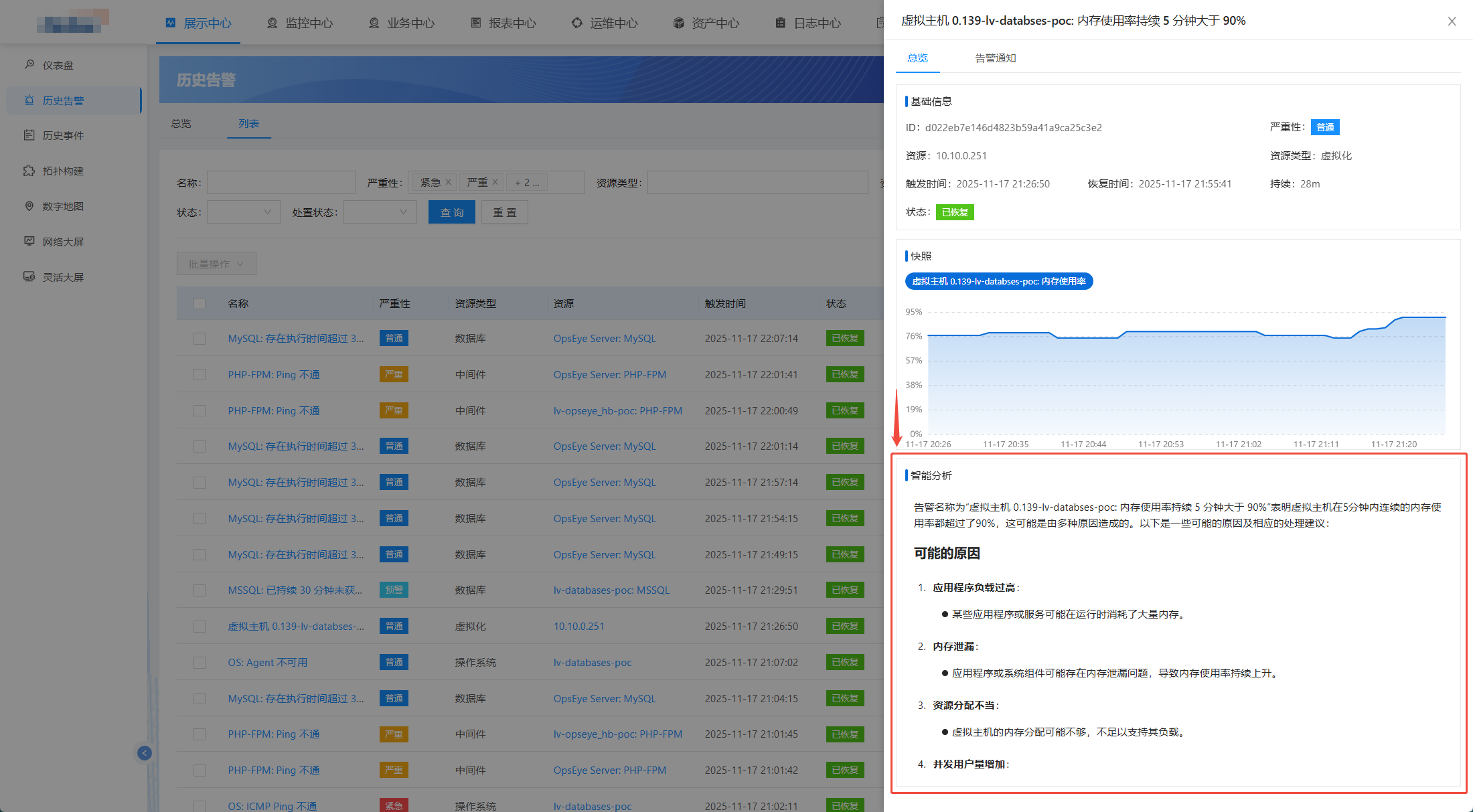 根因分析与处置建议:以 OpsEye智能监控平台历史告警 为例,其将历史告警与 AI 深度融合,借助机器学习对海量历史告警数据进行训练,可自动分析故障发生的深层原因,精准定位问题节点;同时结合历史故障处置案例,生成针对性的处置建议,从 “发现问题” 直接衔接 “解决问题”,大幅降低运维人员决策成本。